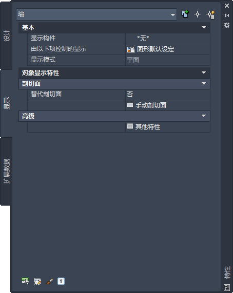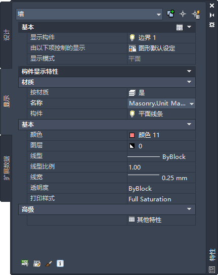 可以使用“特性”选项板的“显示”选项卡修改当前显示模式中选定对象的显示特性设置。可以修改作为一个整体应用于对象的特性(例如剖切面高度)的设置,以及对象的单个显示构件(例如图案填充构件的颜色、图层和线型)的设置。
