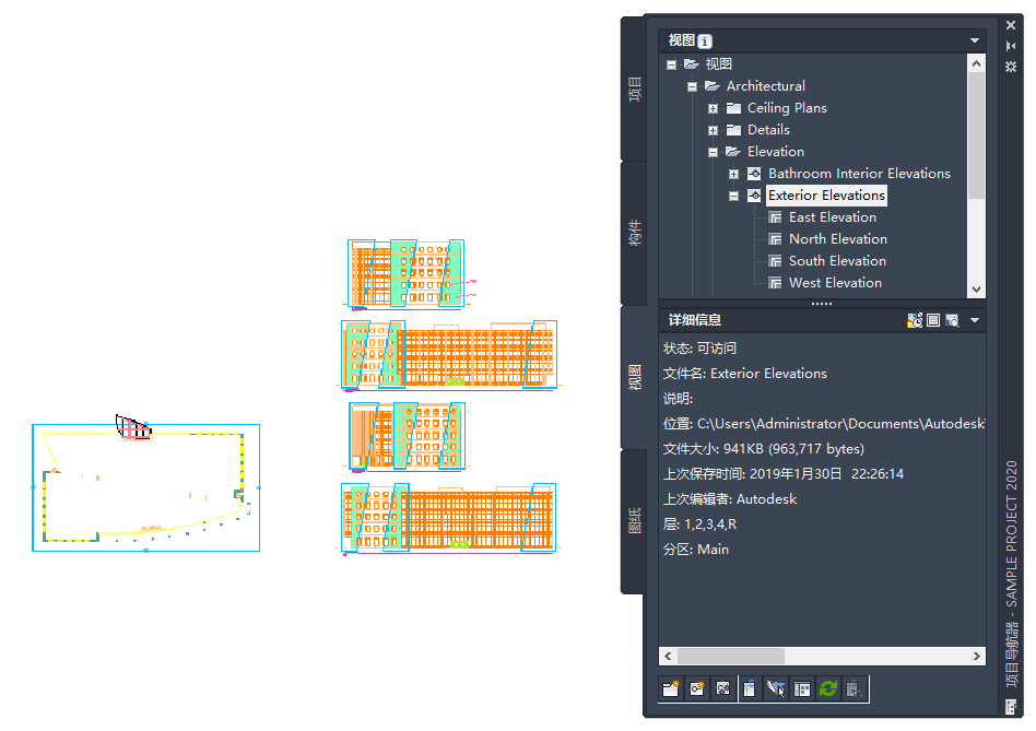 通过从“项目导航器”选项板中选择构件,并将其参照到视图图形中,可以创建视图图形。如果创建多层视图,则每个构件都以其相对层高参照,最低层插入到 Z = 0 处。