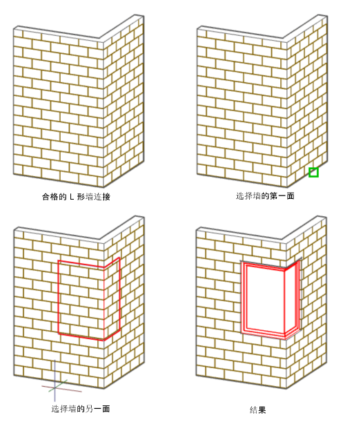 | 墙中的角窗 | 选择合格的 L 形墙连接。沿第二面墙指定插入点。 |