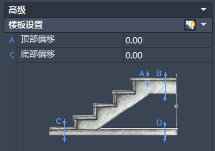 注: “顶部厚度”与“底部厚度”设置值当前对楼梯或梯边梁没有影响。此外,顶部偏移对楼梯并无可见的影响。底部偏移会延伸或截断任何附着的梯边梁。如果显示概略的楼板至楼板高度,这两种偏移值都会对其造成影响。