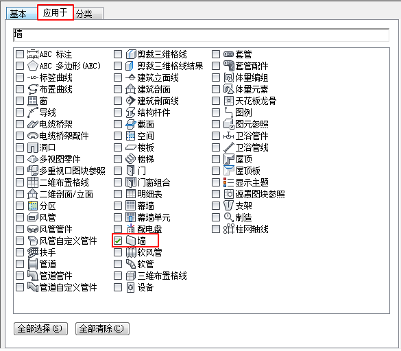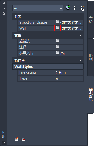 在“特性”选项板中,在“扩展数据”选项卡上的“分类”下,单击“墙”旁边的按钮。