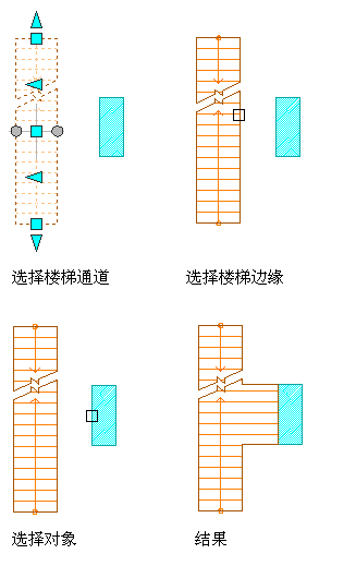 注: 在对具有内部角点的楼梯边缘投影时,如何将楼梯的外侧边缘投影至选定对象是一目了然,但内部角点的投影却不是很清楚。对于这种情况,并没有猜测正确的解决办法,而是不进行投影,并显示一个对话框,说明具有内部角点的楼梯边缘仅能投影到延伸到楼梯两端之外的对象。