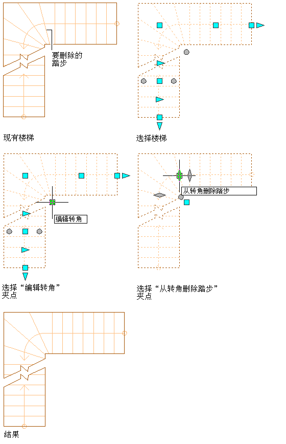 - 完成踏步的删除后,可以单击“退出编辑转角”夹点返回到默认楼梯编辑模式,或者单击鼠标右键,然后单击“全部不选”禁用夹点。