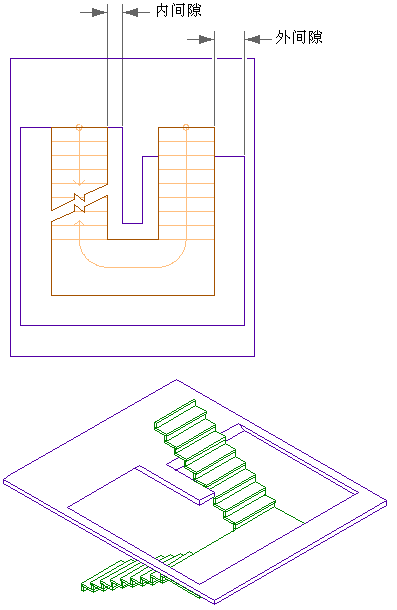 使用以下步骤可以在楼板中创建楼梯干涉区域。在楼梯和楼板之间添加干涉条件后,将根据指定的梯段净空高度与左间隙和右间隙(对于直跑楼梯和多向平台楼梯来说)或者内间隙和外间隙(对于螺旋楼梯和 U 形楼梯来说),在楼梯周围切割出一个长方体。