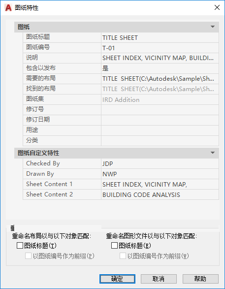 显示选定图纸的特性。还显示自定义特性(如果有)。可以输入新值以修改任何图纸特性。“需要的布局”是保存图纸的图形的路径和文件名。“找到的布局”是在其中找到图纸的图形的路径和文件名。如果需要指定其他路径,可以在“预设的布局”中修改路径和文件名。此操作将图纸和图纸集重新关联。