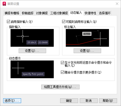 “指针输入”下的设置会影响“动态输入”处于活动状态时输入坐标值的方式。单击“设置”以打开“指针输入设置”对话框。
