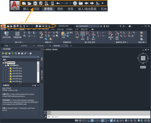 从功能区中,您可以访问本手册中显示的所有功能。此外,显示的快速访问工具栏还包含 AutoCAD Electrical toolset 中使用的某些导航命令。