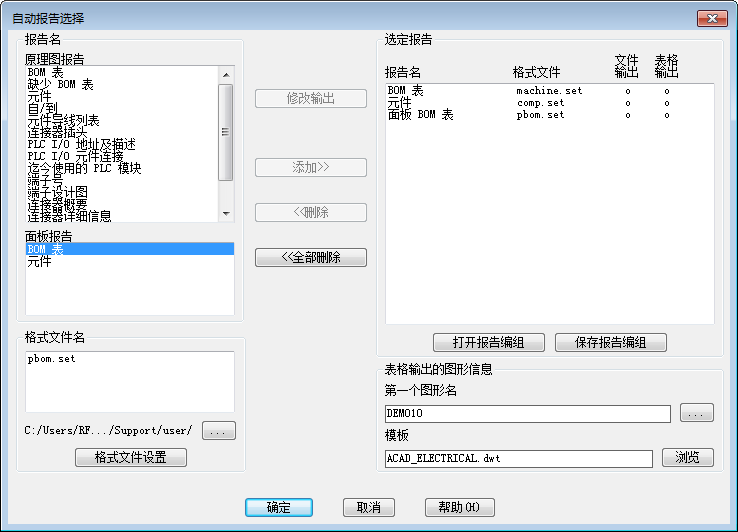 为要运行的每个报告选择报告名称和格式文件 (.set)。格式文件应定义文件输出、表格输出或这两者。