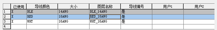“更改/转换导线类型”对话框中将列出为激活图形定义的所有有效的导线图层。导线图层名称、导线特性(例如颜色、大小)以及用户定义的特性都列在栅格中。“已使用”列中的“X”表示当前正在使用该图层名称。