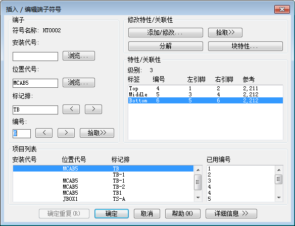 - 在“插入/编辑端子符号”对话框的“修改特性/关联性”区域中,单击“添加/修改”。