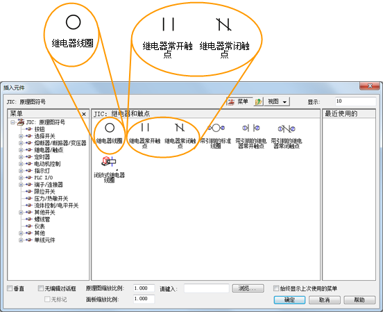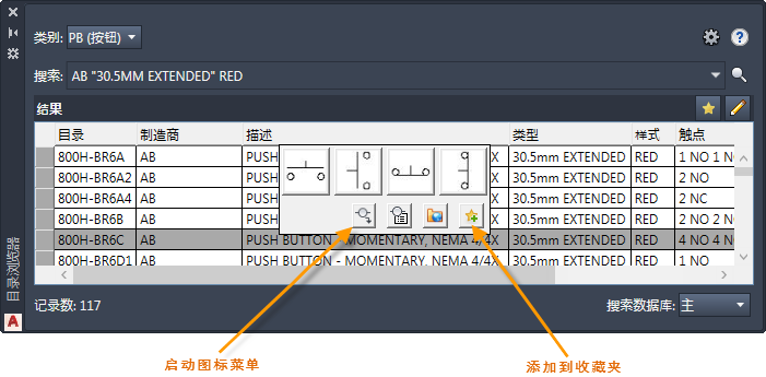 图标菜单允许您通过选择符号类型(例如,常开按钮或三档位选择开关)来插入符号。插入符号后,您可以为其注释描述、目录信息等等。
