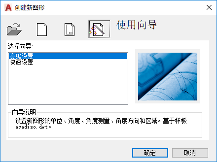 “从头开始”将使用英制或公制默认设置创建新图形。“使用样板”将使用所选图形样板中所定义的设置创建新图形。“使用向导”将使用“快速”向导或“高级”向导中指定的设置创建新图形。(使用 NEW 命令时,对话框中的第一个选项“打开图形”不可用。要打开现有图形,请使用 OPEN 命令。)