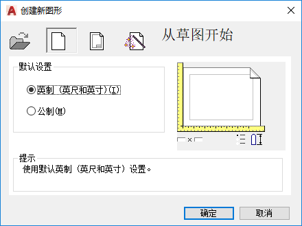 使用默认的“英制”或“公制”设置创建空图形(参见 MEASUREINIT 系统变量)。 使用 MEASUREMENT 系统变量可以改变给定图形的度量衡系统。启动程序时打开的 Drawing1.dwg 是从头创建的图形。