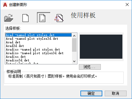 列出图形样板文件位置(在“选项”对话框中指定)中当前存在的所有 DWT 文件。选择一个文件作为新图形的基础。
