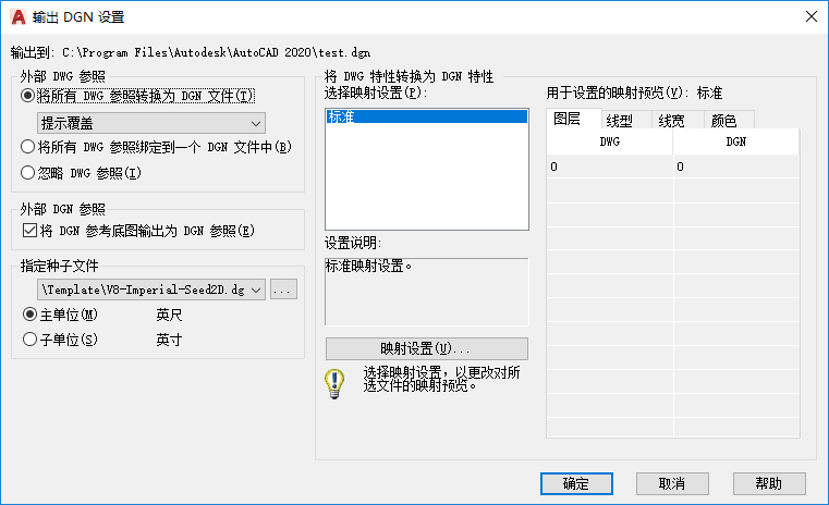 “标准”是默认的映射设置,使用该设置,可以从要输出的图形中提取数据并将自动映射应用到 DGN 图层、线型、线宽和颜色(如映射预览中所示)。