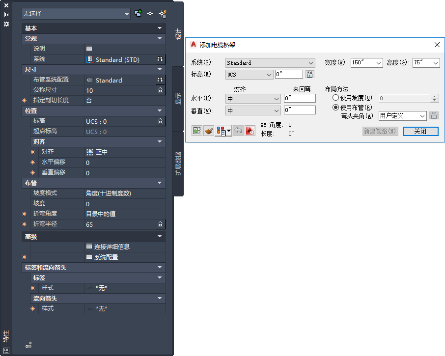 2. 对于剩余的步骤,请使用“特性”选项板设置套管,或使用“添加电缆桥架”对话框设置电缆桥架,如下图所示。
