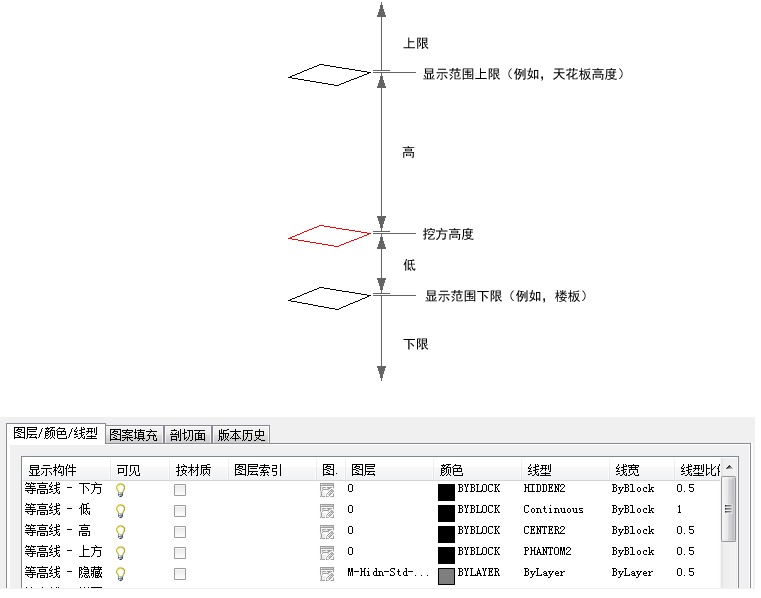 等于或低于此范围但是高于剖切高度的对象将使用“高”显示构件进行显示。