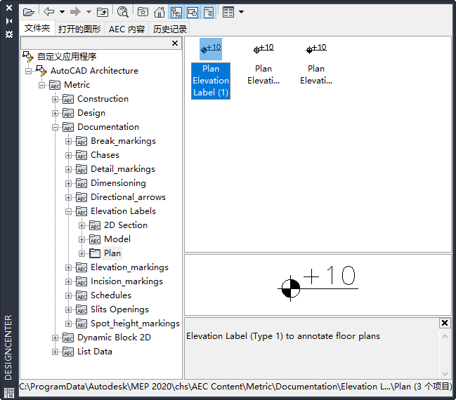 建筑、工程和施工 (AEC) 内容包括图形、符号、对象样式以及添加到图形中以便设计和记录项目的注释例程。可以使用在设计中心内访问的预定义 AEC 内容在工具选项板上创建工具。还可以从“设计中心”中的块创建工具,但它们的工具选项略有差异。