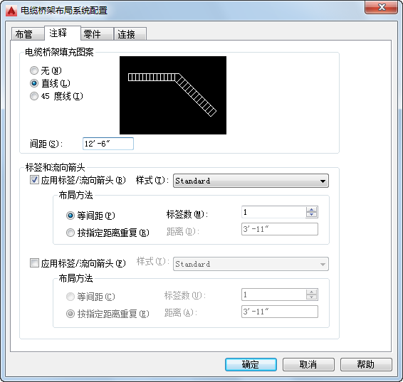 在绘制电缆桥架管路时,可以指定要为其添加的标签或流向箭头。还可以指定要应用的填充图案。可以指定垂直线或 45 度线以及要使用的线间距。