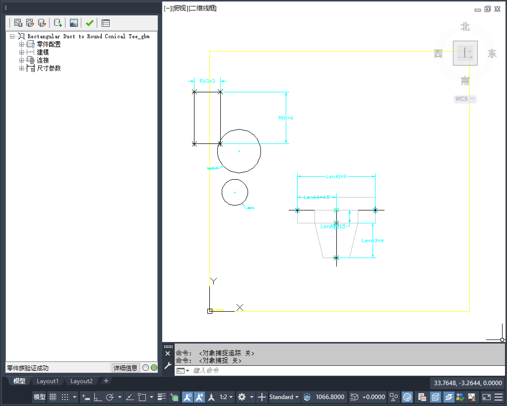 选择创建或修改参数化零件时,构件编辑器使用参数化构建环境。以下示例中的构件编辑器显示了矩形风管到圆锥形接头 T 形三通的连接。有关详细信息,请参见“启动构件编辑器”。