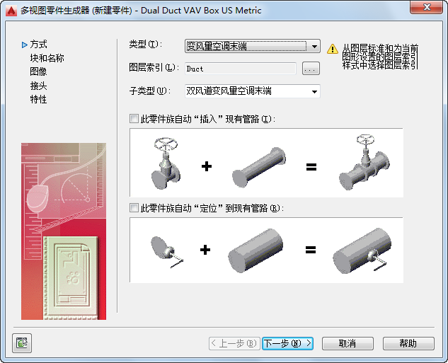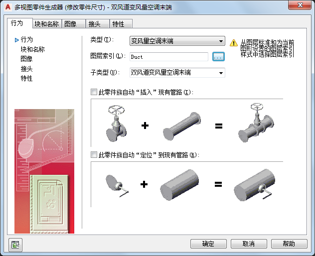 “构件编辑器”对话框提供了多个任务特定的选项,可用于在 AutoCAD MEP toolset 中构建自定义零件。可以创建或修改参数化零件和基于块的零件。