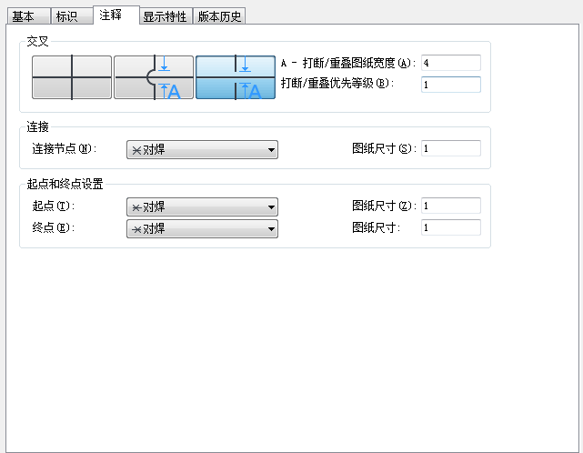 6. 在“连接”下,为线交叉点选择一个连接节点符号,然后输入尺寸。