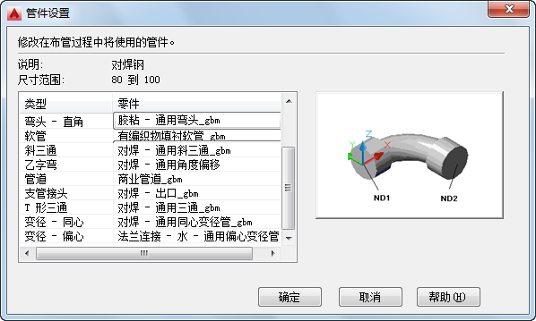 可以在绘制管道管路时替代布管系统配置,然后指定另一个要使用的零件。例如,如果要对特定管路使用带螺纹的接头而不是默认的对焊连接接头,就可以替代默认接头。