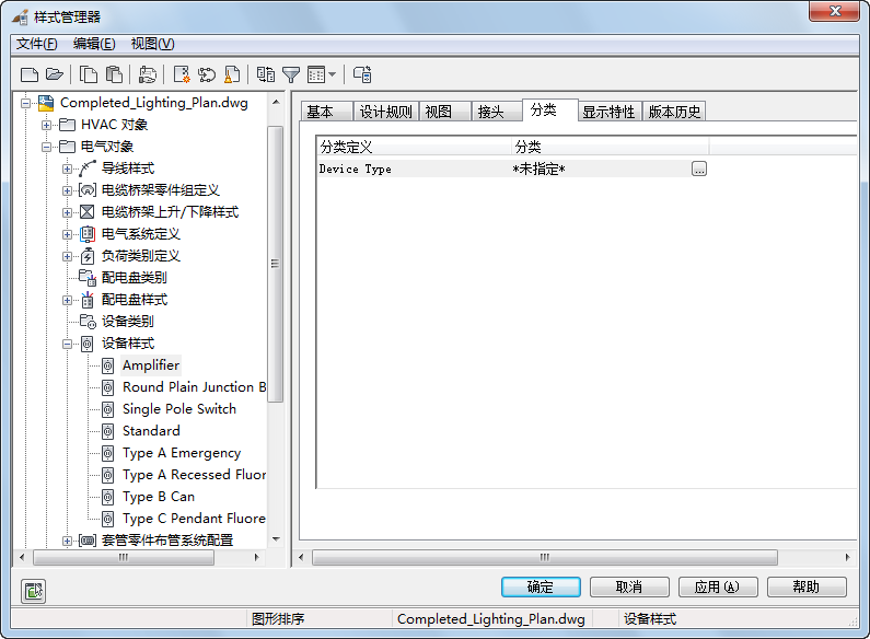 适用于设备的分类定义显示在每种设备样式的“分类”选项卡上。在配置设备样式时,可以在该选项卡上指定“设备类型”分类定义以及任何自定义分类定义的分类。随软件附带的大多数设备样式均指定“设备类型”分类定义的分类。