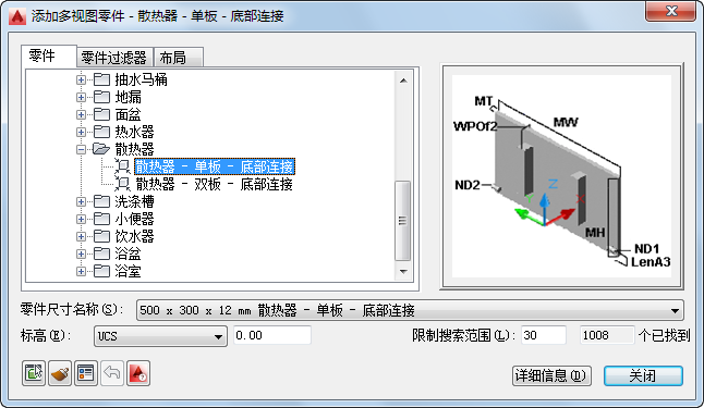 2. 导航到“添加多视图零件”对话框的树视图中的“管道 - 散热器”,并从该列表中选择一个零件尺寸名称作为“零件尺寸名称”。