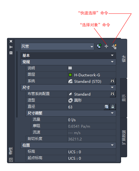 风管“特性”选项板上的示例