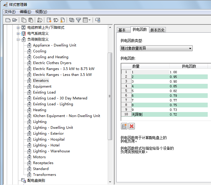 软件为每个供电因数指定一个值,该值乘以负荷可确定某个负荷类别的供电负荷。定义供电负荷是很重要的,有助于避免回路超负荷。通过定义供电因数,还可以实际计算估计供电负荷。