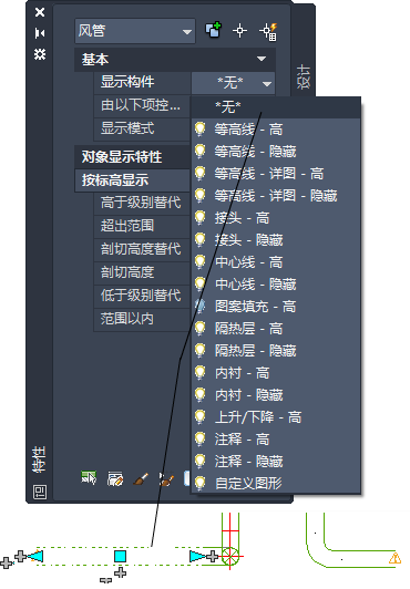 用户可以配置这些显示构件,以显示或隐藏下列 AutoCAD MEP toolset 对象(在与楼层平面和剖切面相对的位置):