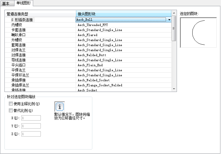 为单线管道显示配置图形时,将接头类型与最能在当前图形中表示它的图形块相匹配。