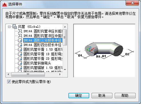 如果尝试在系统配置中未存储的管路中添加或修改零件,则会显示“选择零件”对话框。系统将提示您替换为目录中的其他对象。以下示例显示了在“通用”配置中的“风管系统”域中的对话框: