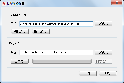 2. 在“批量转换设备”对话框中的“转换脚本文件”下,为“路径”指定用于将块转为设备样式的设备转换脚本(CCF 文件)。