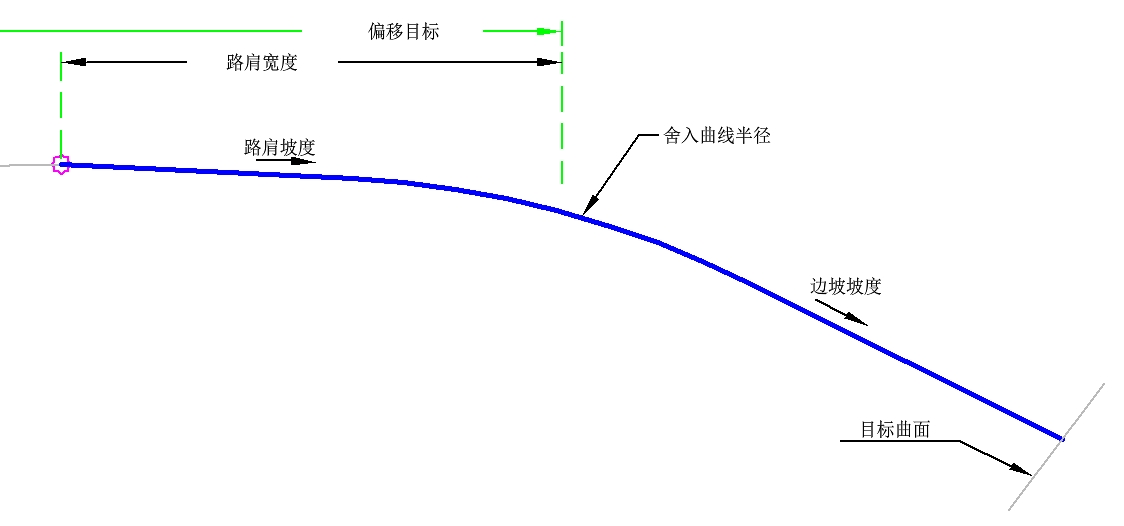 可用于替代路肩宽度,并将路肩宽度连接到偏移路线。以下对象类型可用作用于指定偏移的目标:路线、多段线、要素线或测量地物。 可选