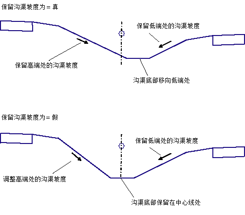 对于沟渠坡度顶部的点位于不等高程处的情况,请选择是保留沟渠边坡而移动沟渠位置,还是将沟渠保留在中心处而调整高侧上的边坡。 |