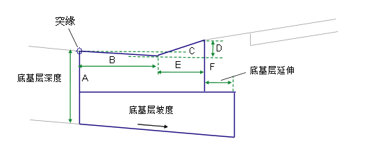 将基于输入参数“标注 A”到“标注 F”的标注插入路缘和边沟连接。所有标注都必须为非零的正值。如果给定非零的“底基层深度”,那么底基层将被插入到路缘后部,并延伸至“底基层延伸”宽度。底基层接近于路缘后部的底部,如图所示。