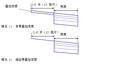 在布局模式中,此部件将被附着到任一便利的点。叠加层按以下样式来显示:深度为统一的值、宽度为 3.6 米(或 12 英尺)、坡度为 -2%。加宽车道将从叠加边缘 -2% 的坡度扩展给定的宽度和深度。