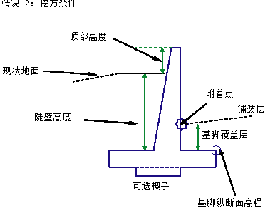 陡壁高度由从基脚顶部到垂直面上地面高程的插入点之间的距离来确定,无论哪个点处于较高的位置。陡壁倾斜边坡、基脚宽度、陡壁垂直面的偏移、可选楔子标注及键中心点的位置都是陡壁高度的函数。