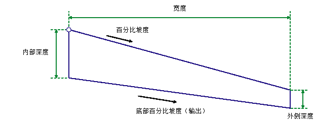 将从附着点向外插入给定宽度和百分比坡度的造型的完工坡面。底部连接坡度可以基于造型的内部和外侧深度来计算。点、连接和造型代码可以在使用用户定义字符串的输入参数中设置。