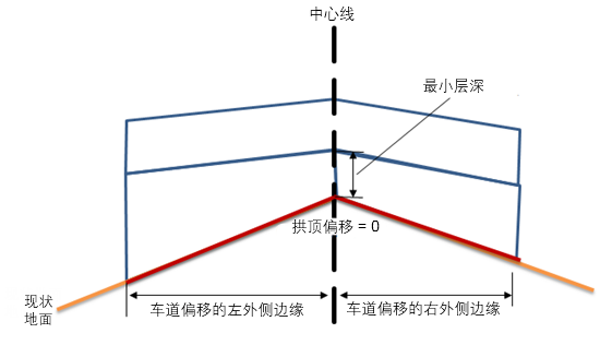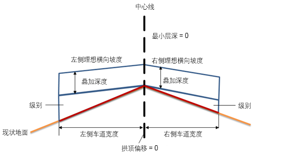 | 路拱使用纵断面选项 | 选择该功能可将加铺的内侧边缘连接到纵断面,或者将路拱点高程调整为最小整平深度 | 用户定义 | 最小整平深度 |