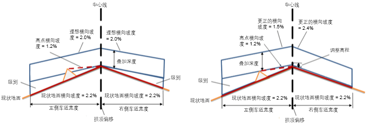 | 更正的横向坡度 | 更正的横向坡度将调整为介于 -1.5% 和 -2.5% 横向坡度之间的值 |