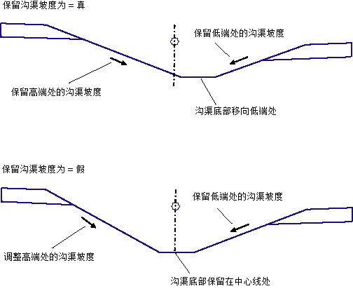 对于沟渠坡度顶部的点位于不等高程处的情况,请选择是保留沟渠边坡而移动沟渠位置,还是将沟渠保留在中心处而调整高侧上的边坡。 |