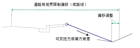 用“道路用地界限制偏移”加上或减去“偏移调整”来计算边坡偏移。将边坡连接从附着点插入到目标曲面上计算出的偏移处。