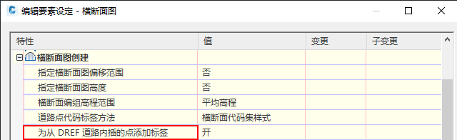 有关此设置的详细信息,请参见“编辑要素设定 - 横断面图”对话框。有关标注道路点的详细信息,请参见标注横断面图中的道路点代码的步骤。