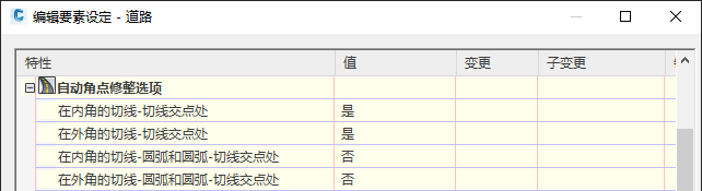 可以使用这些选项独立控制是否在切线-切线相交处和切线-圆弧相交处修整固定宽度道路的内角和外角。