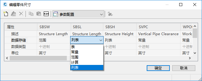 - 要为零件添加可用尺寸的列表,请将尺寸参数的数据存储类型更改为“列表”。