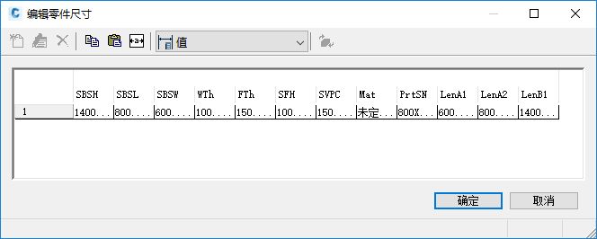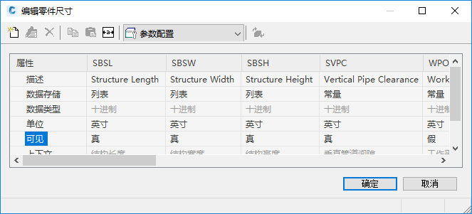 将显示“编辑零件尺寸”对话框,显示选定零件的所有当前可用的尺寸参数。对于简单圆柱形结构零件示例,某些默认尺寸参数为“零件尺寸名称”(PrtSN) 和“结构垂直管道净空”(SVPC)。