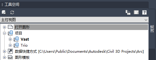 “浏览”树的“主控视图”包含四个与图形和项目相关的集合:“打开图形”、“项目”、“数据快捷方式”和“图形模板”。